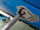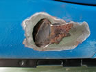 小さな穴を塞いだり、切り出した鉄板をボディに付けるには、通常溶接を用いますが、今回はあまり強度を必要としない部位なので、超強力な接着剤(パネルボンド)を使用します。 |