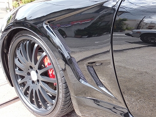 FRPフェンダーに映った景色が綺麗です。こういった所が車の質感をアップします。 ブラックのボディカラーは如実に仕上がりが判ります。 凸凹していると気持ちが萎えます。