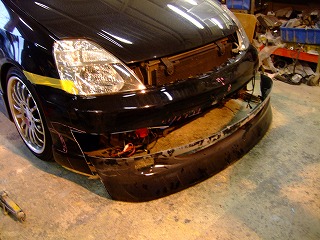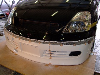 FRP製の社外バンパーの取付・加工は 随時承っております。 今回の作業は他車種流用のフロントバンパー加工です。 |